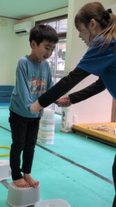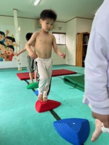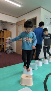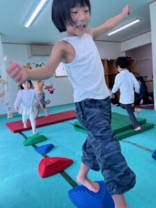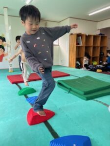 バランスボード渡りでは床に足をつけないように進んでいくよ~(^O^)