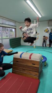 トランポリンのばねをうまく使って跳び箱跳び越えていくよ‼